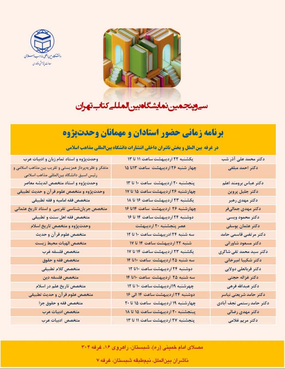 برنامه حضور استادان و مهمانان در غرفه انتشارات دانشگاه بین المللی مذاهب اسلامی در سی و پنجمین نمایشگاه بین المللی کتاب تهران