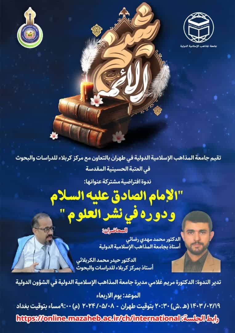 در راستای اجرایی سازی تفاهم نامه همکاری، دانشگاه بین المللی مذاهب اسلامی با همکاری مرکز پژوهشی کربلا وابسته به آستان مقدس امام حسین (علیه السلام نشستی مجازی با عنوان "الامام الصادق (علیه السلام) و دوره فی نشر العلوم" در ۱۹ اردیبهشت ماه سال ۱۴۰۳ برگزار کرد.