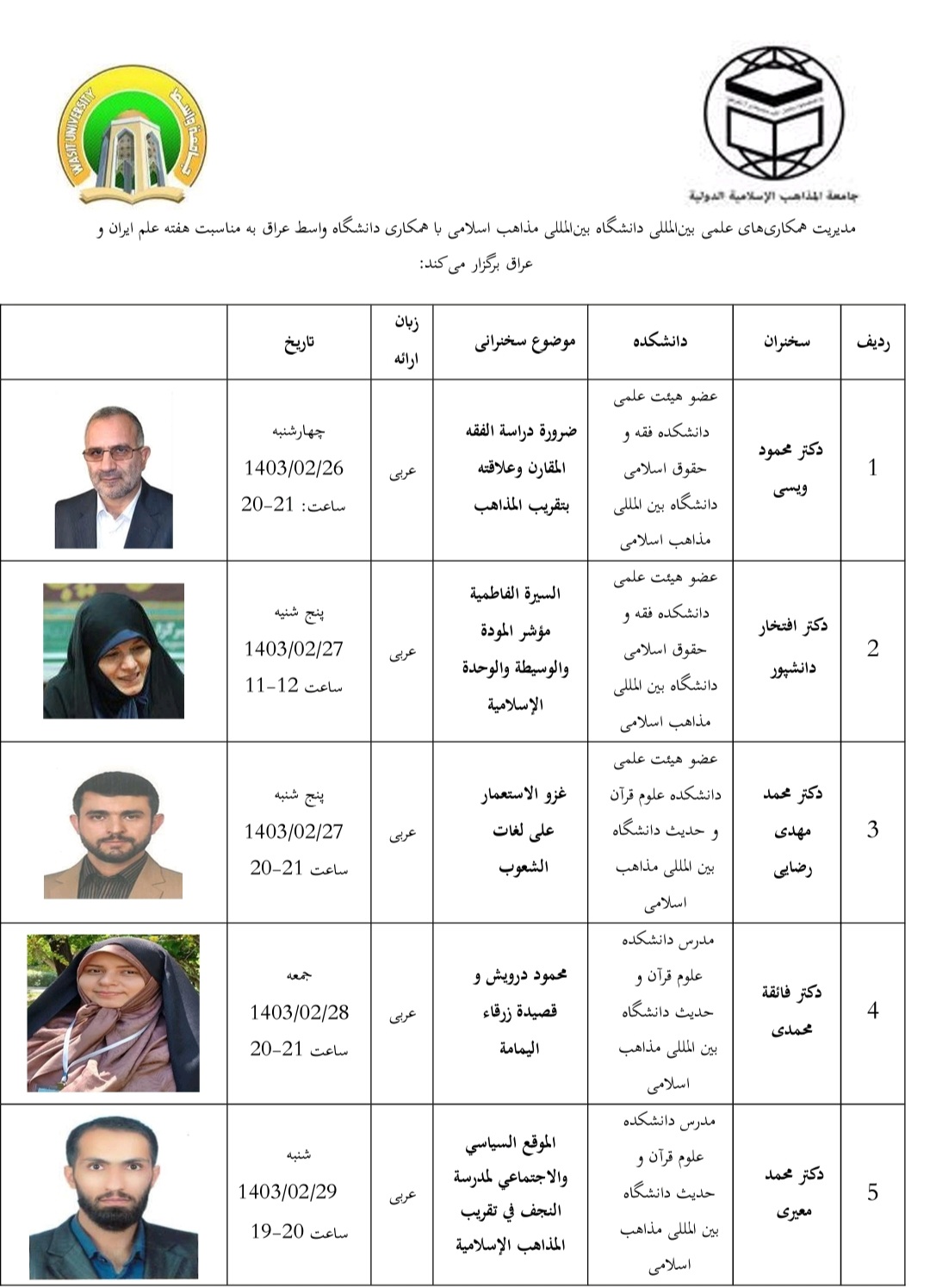 به مناسبت هفته علم ایران و عراق سلسله نشست های تخصصی در زمینه های مختلف علمی در راستای رسالت دانشگاه بین المللی مذاهب اسلامی توسط مدیریت همکاری های علمی بین المللی دانشگاه و با همکاری دانشگاه واسط عراق برنامه ریزی و در حال برگزاری است.