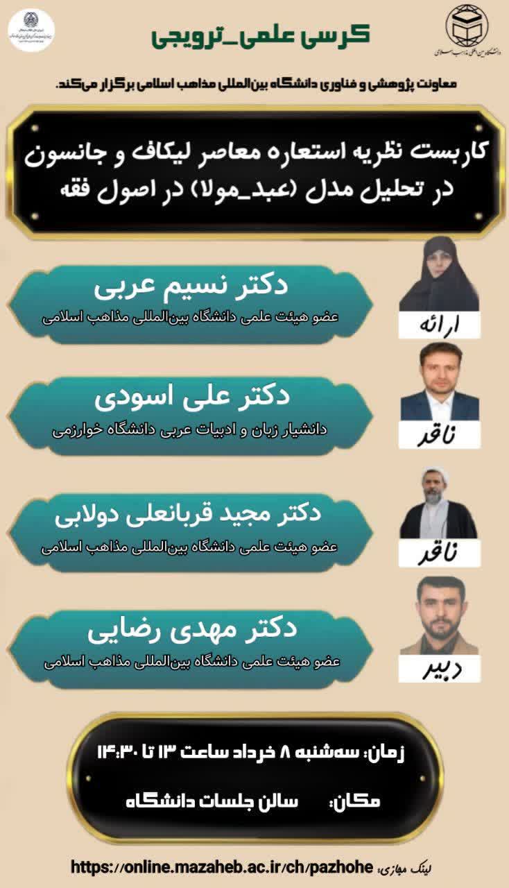 جلسه کرسی علمی ترویجی با موضوع «کاربست نظریه استعاره معاصر لیکاف و جانسون در تحلیل مدل (عبد _مولا) در اصول فقه» سه شنبه 8 خرداد ماه در سالن جلسات دانشگاه بین المللی مذاهب اسلامی برگزار گردید.