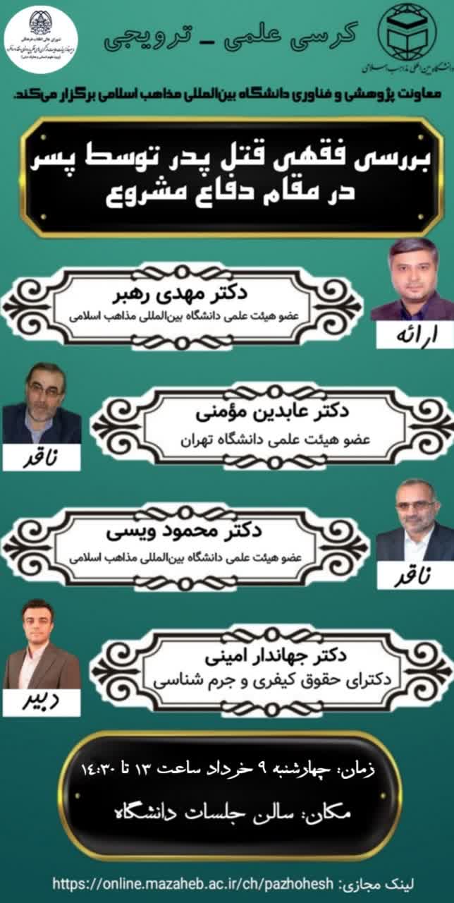روز چهارشنبه 9 خرداد ماه جلسه کرسی علمی ترویجی با عنوان: «بررسی فقهی قتل پدر توسط پسر در مقام دفاع مشروع» در سالن جلسات دانشگاه بین المللی مذاهب اسلامی برگزار شد.