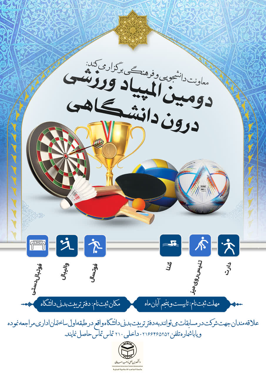 اسامی تیم‌ها و اعلام آمادگی انفرادی جهت ثبت‌نام تا تاریخ 25/0/1403 بوده و در دفتر تربیت‌بدنی دانشگاه واقع در طبقه اول ساختمان اداری انجام می‌شود.
