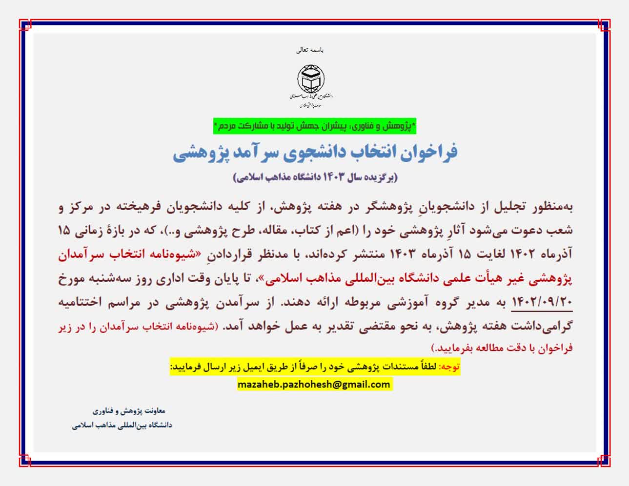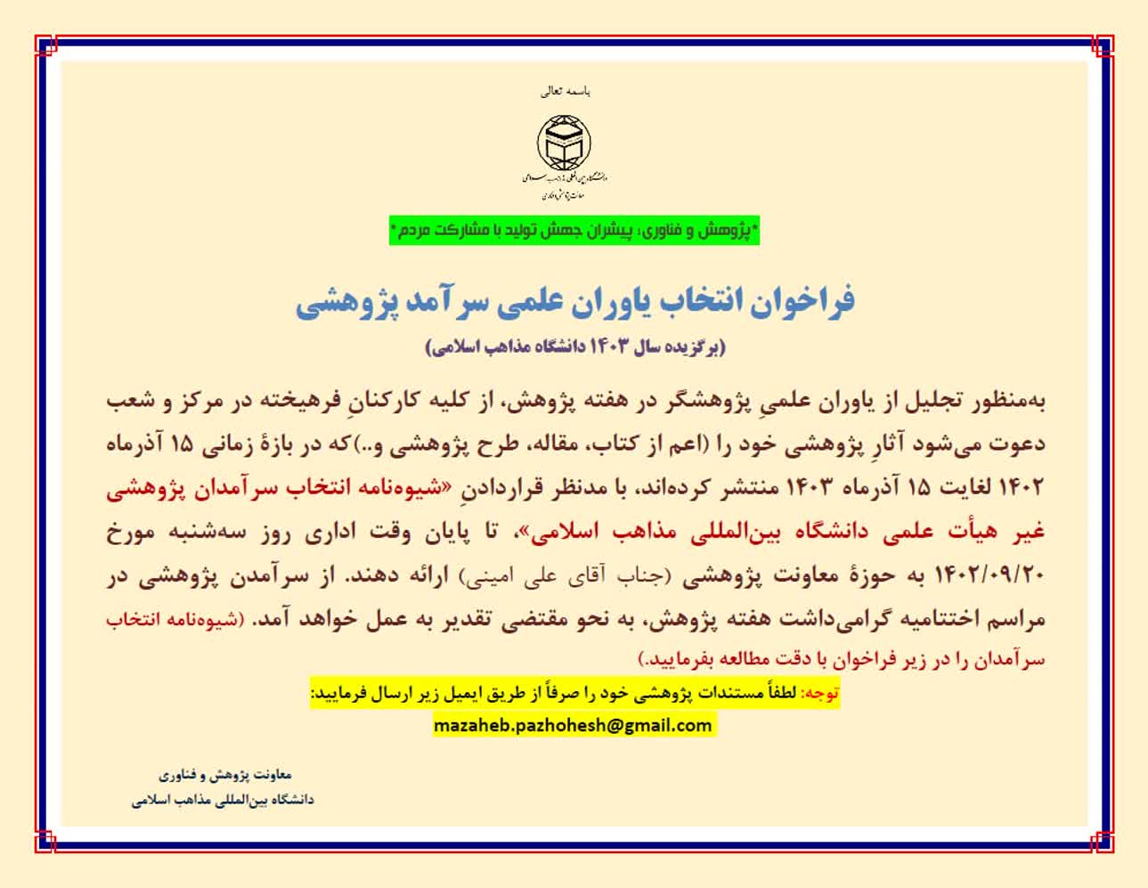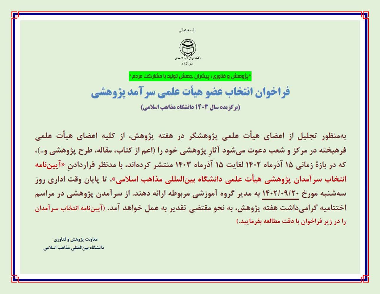 فراخوان انتخاب عضو هیأت علمی، دانشجو و سرآمدان پژوهشی غیر هیأت علمی دانشگاه بینالمللی مذاهب اسلامی در سال ۱۴۰۳