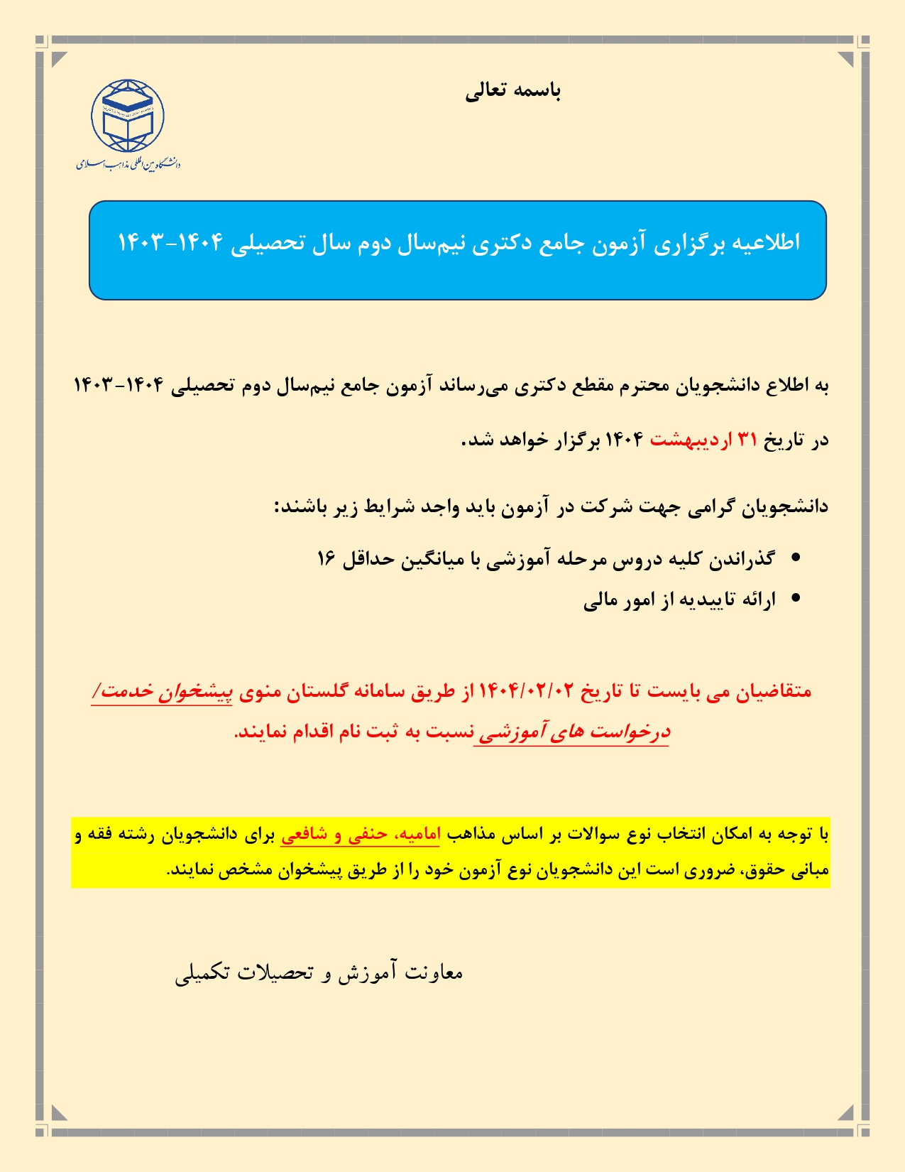 اطلاعیه ثبت نام آزمون جامع دکتری نیمسال دوم ۱۴۰۳-۱۴۰۴ دانشگاه بینالمللی مذاهب اسلامی