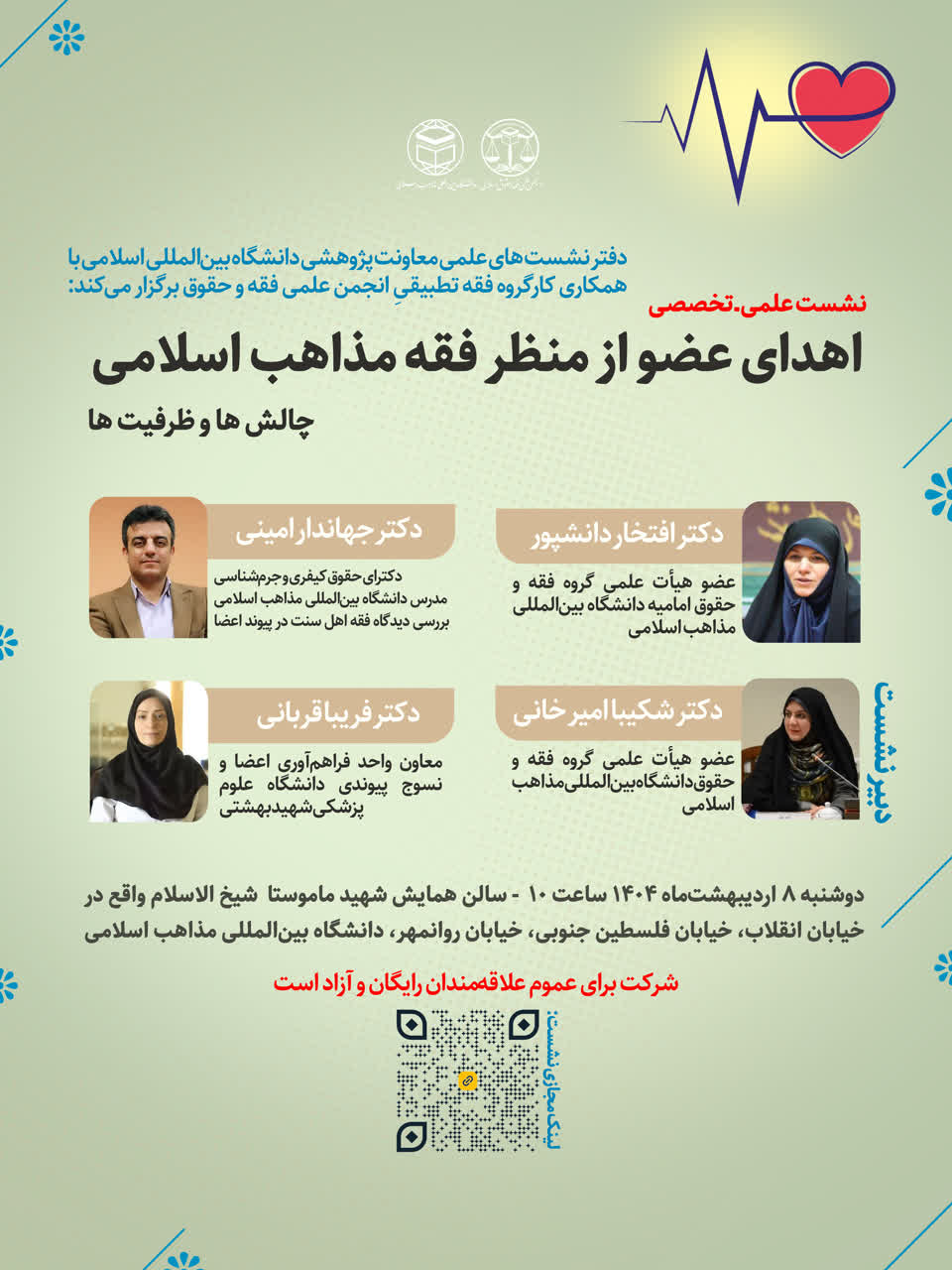 دفتر نشست های علمی معاونت پژوهشی دانشگاه بینالمللی اسلامی با همکاری کارگروه فقه تطبیقیِ انجمن علمی فقه و حقوق برگزار میکند: نشست علمی ـ تخصصی: 《بررسی مبانی فقهی و حقوقی چالشهای اهدای عضو در میان مذاهب اسلامی》