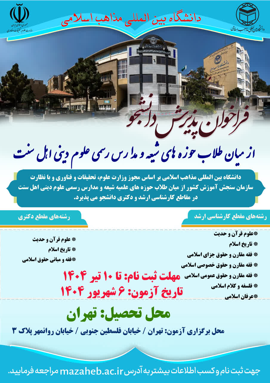دانشگاه بین المللی مذاهب اسلامی با مجوز وزارت علوم، تحقیقات و فناوری و با نظارت سازمان سنجش و آموزش کشور از میان طلاب حوزه های علمیه شیعه و مدارس علوم دینی اهل سنت از طریق آزمون اختصاصی در سال 1404 در مقاطع کارشناسی ارشد و دکتری تخصصی دانشجو می پذیرد.