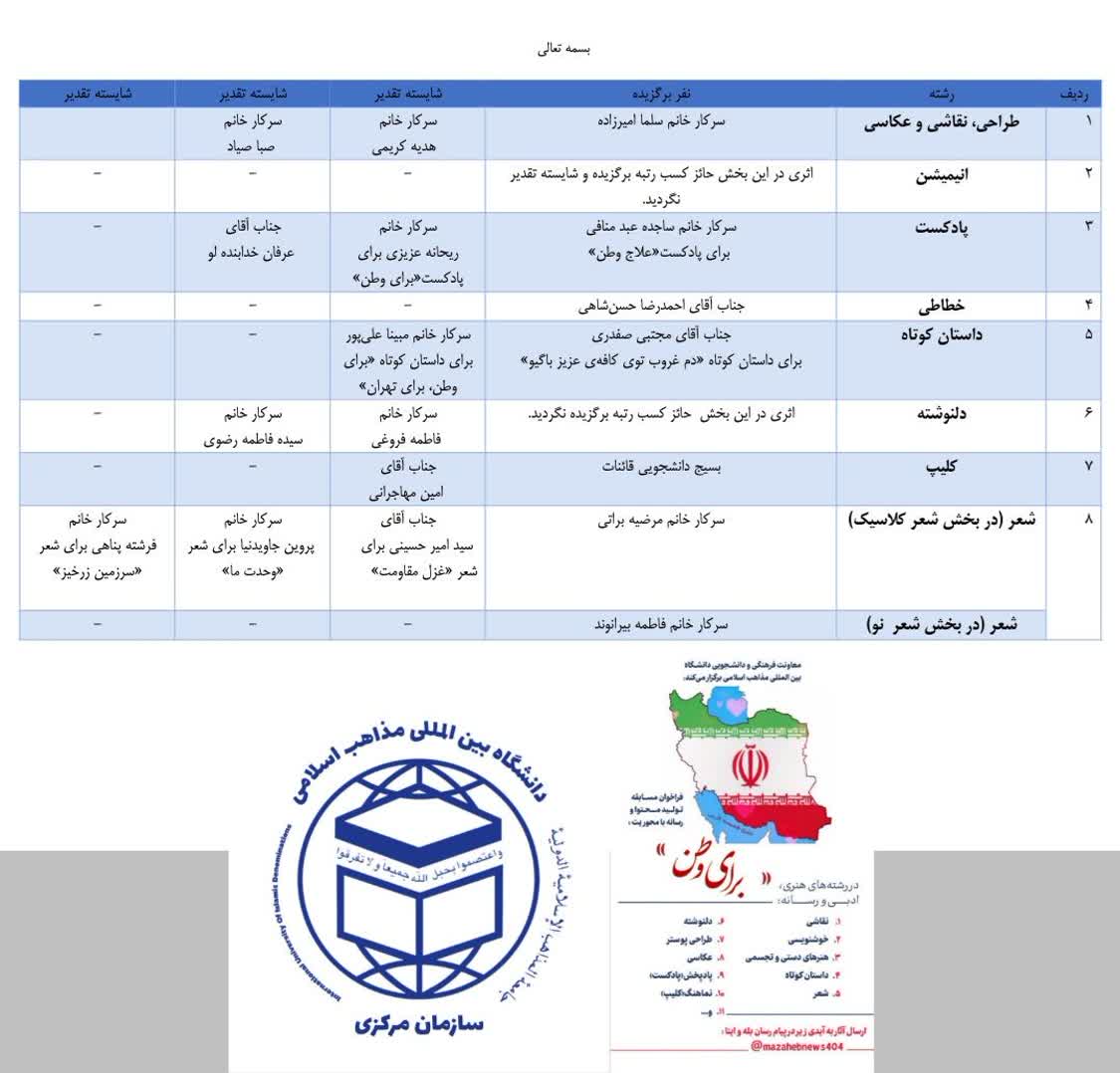 نتایج مسابقه سراسری تولید محتوا و رسانه با محوریت《برای وطن》 که به همت معاونت فرهنگی و دانشجویی دانشگاه بین المللی مذاهب اسلامی در واکنش به جنگ ۱۲ روزه در رشتههای مختلف هنری، ادبی و رسانه برگزار گردید، پس از داوری با حضور اساتید و داوران برجسته، مشخص و اسامی برندگان به شرح زیر اعلام می گردد.