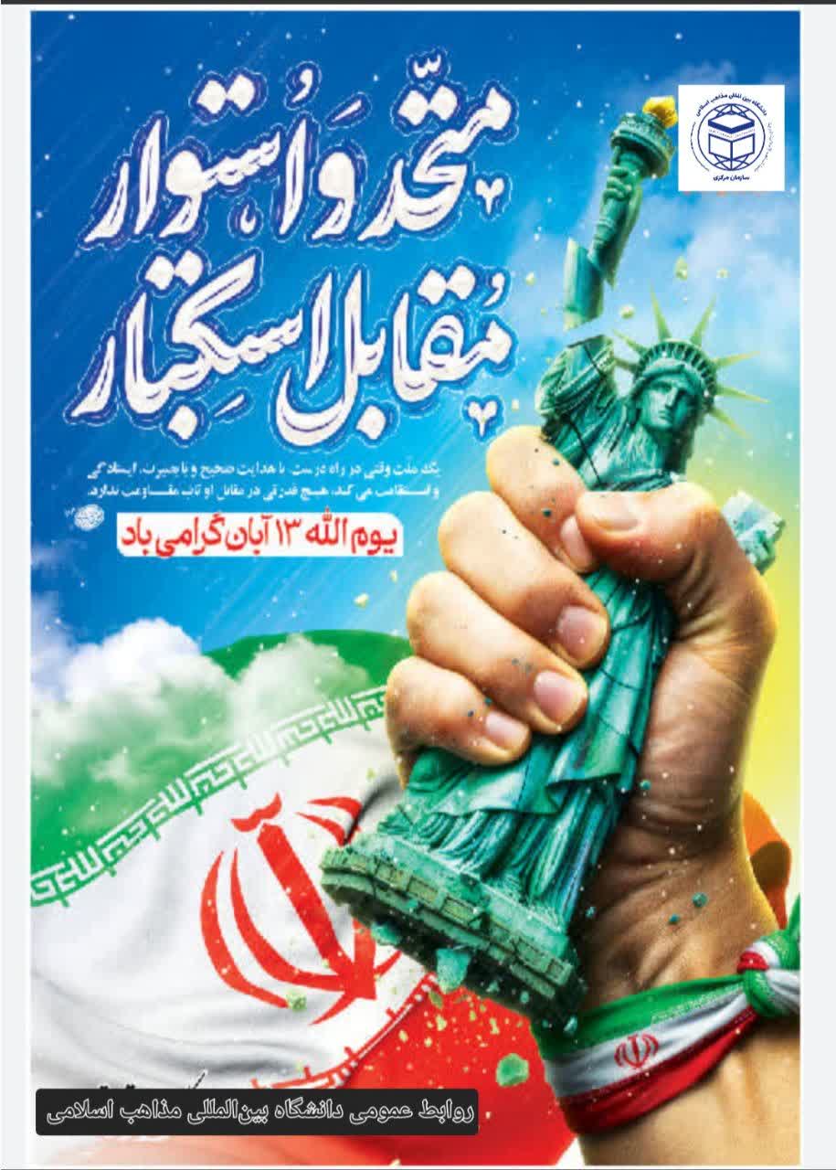 یومالله ۱۳ آبان نماد وحدت، مقاومت و بیداری ملت ایران در برابر ظلم و زورگویی است؛ روزی برای تجدید عهد با آرمانهای امام خمینی (ره)، وفاداری به خون شهیدان و تبعیت از رهنمودهای رهبر معظم انقلاب اسلامی (مدّ ظله العالی).